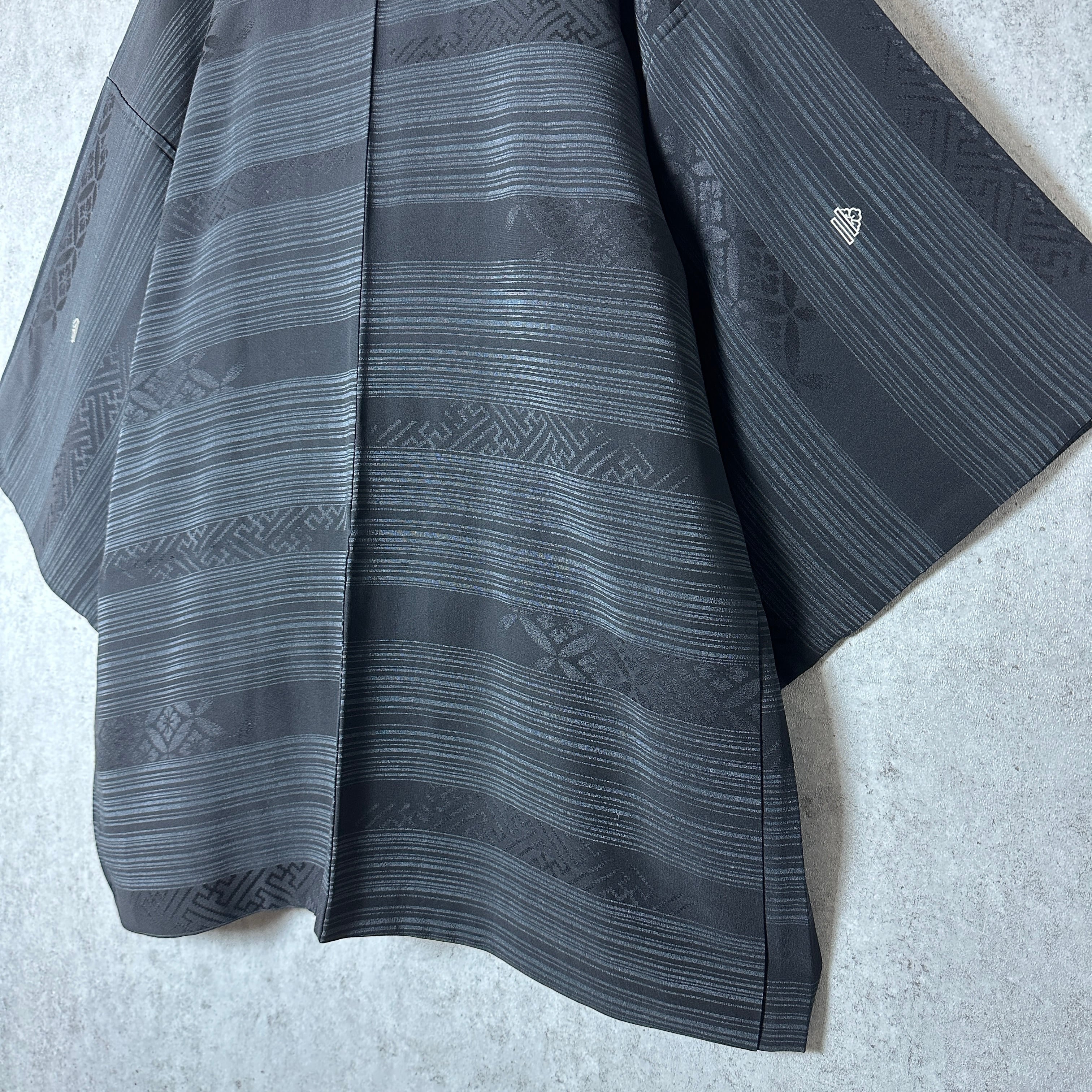 漆黒の中に織り込まれた伝統文様が、光の角度によって静かに浮かび上がる一着。